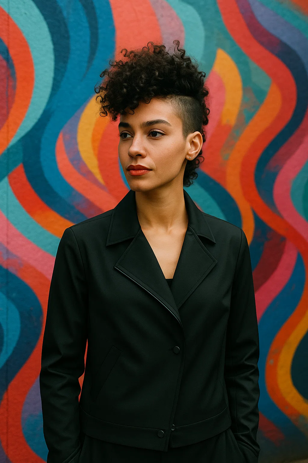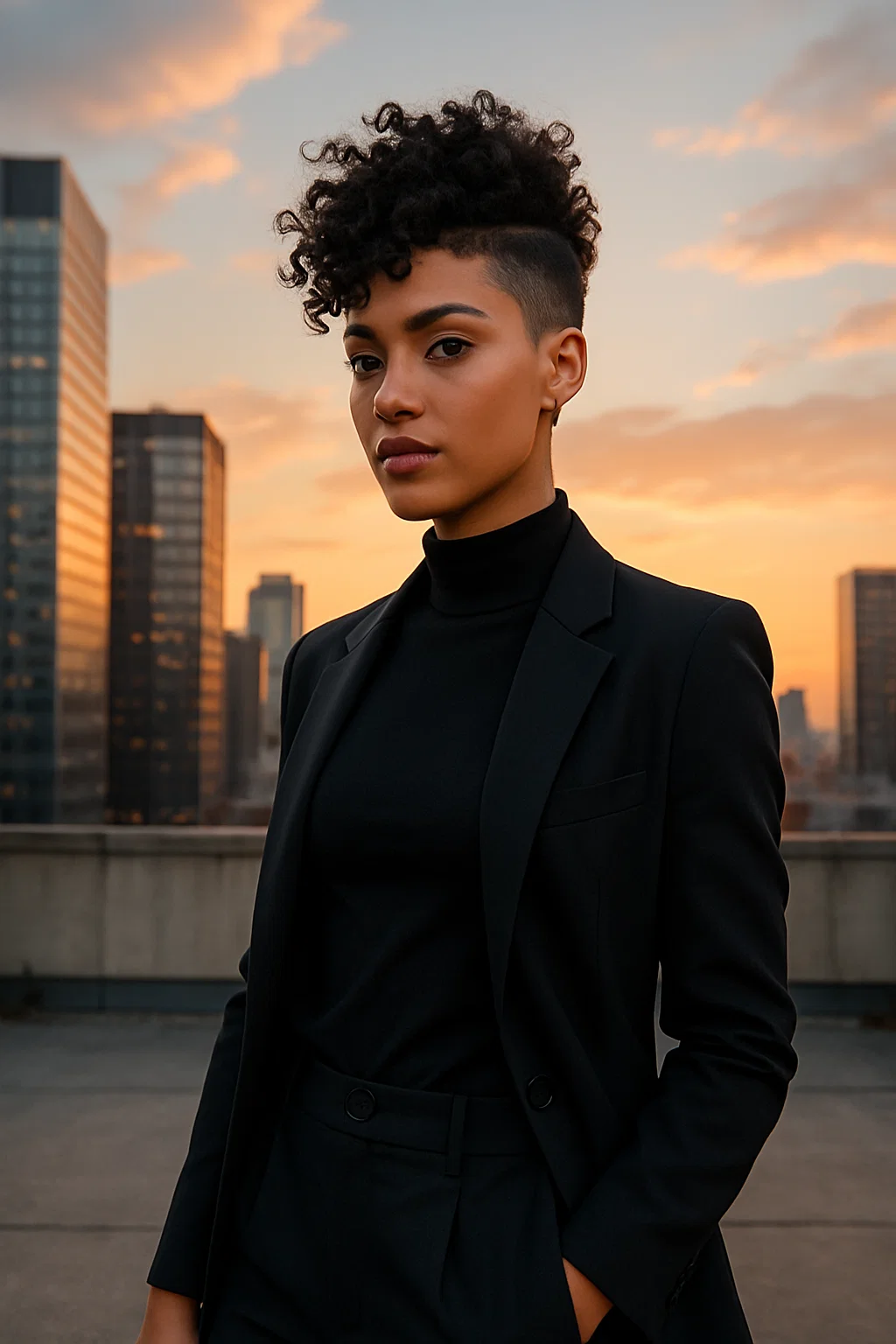 A daring and modern haircut — shaved sides with voluminous curls on top for a bold, fashion-forward statement.