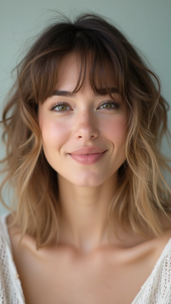 When styling, use a texturizing cream on damp hair before blow-drying to create movement. Soft waves and bangs together create a fun, youthful vibe that’s easy to maintain with regular trims.