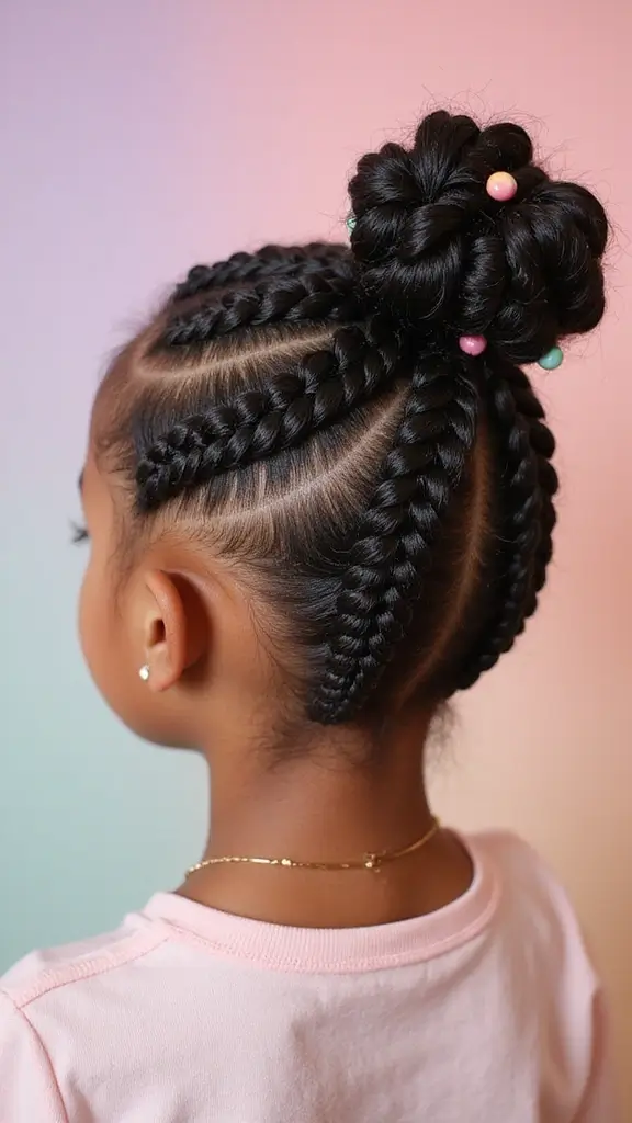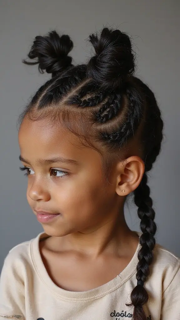 This updo works for weddings, family photos, or a busy school day. It also adapts to natural hair textures, from tight curls to looser coils. Start simple with a single bun, or braid more rows for a fancier look. The result is a neat, polished style that stays put while your child plays.