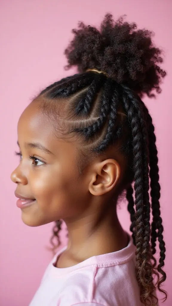 Twisted cornrows to a ponytail also fit current kid hair trends. You can vary the look with thinner or thicker cornrows, switch the ponytail height, or swap in a playful bun for variety. This style is practical and protective for busy days.