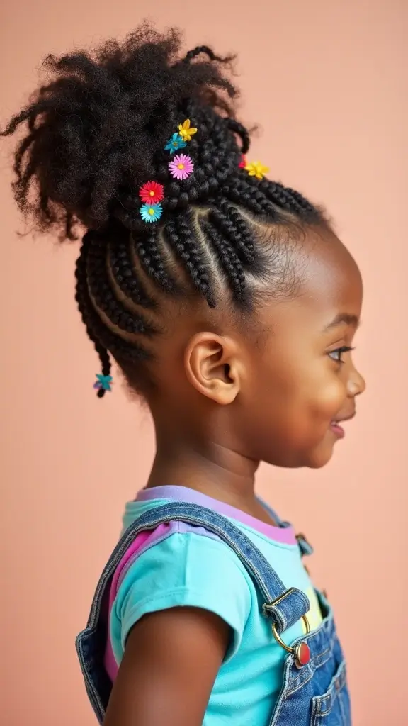 Looking for a hairstyle that stays neat through play and still looks stylish? A cornrow updo fits the need. It keeps hair off the face, so kids can run, jump, and laugh without hair getting in the way. It also holds up longer than many other styles, which means less fuss during the day.