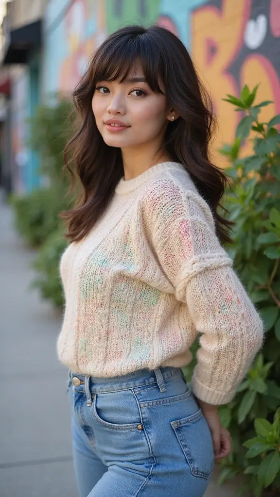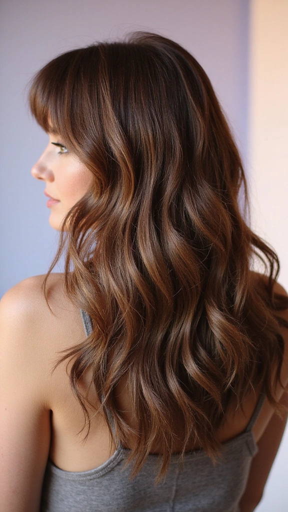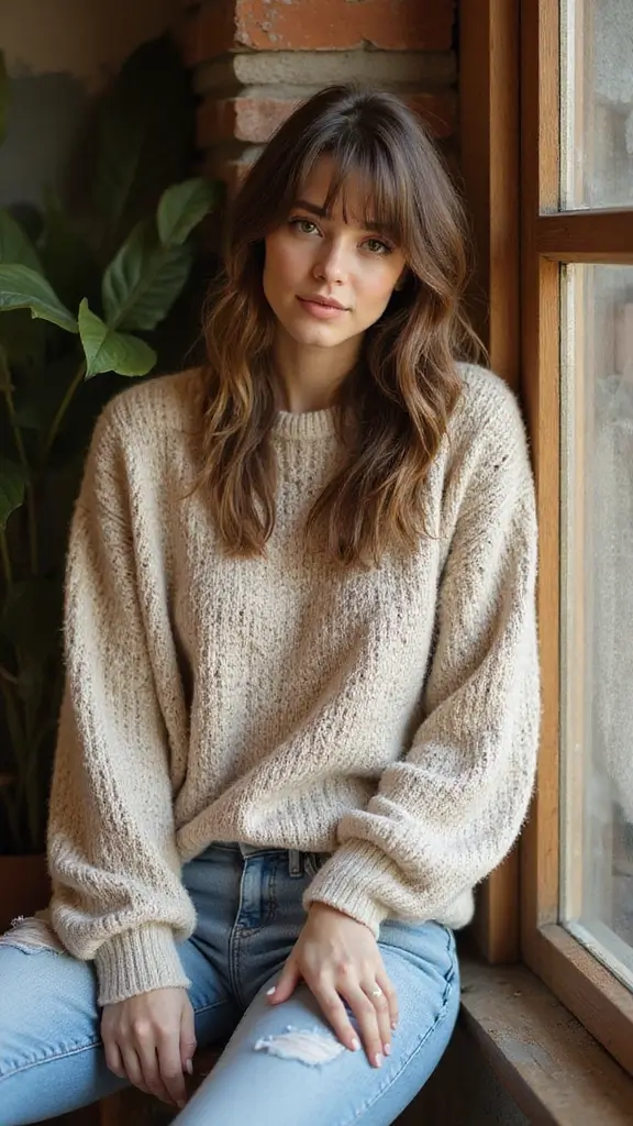 For color you can keep your natural shade or add subtle lowlights. Stay close to your base color for an authentic feel. Trim every 8 to 12 weeks to keep the layers soft and the bangs current. If the bangs feel full, trim a little to preserve the airy look.