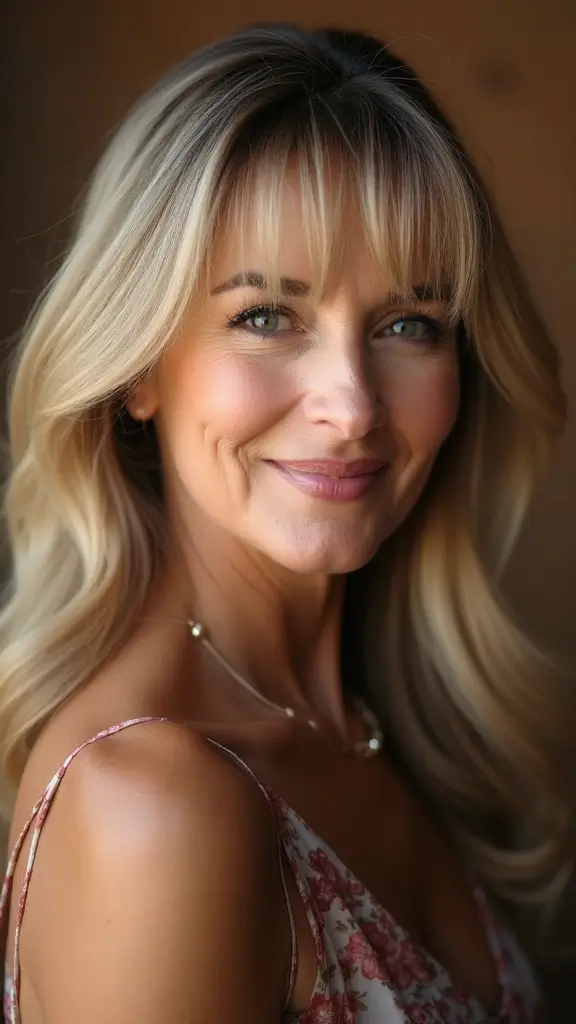 Let your bangs greet your eyes, then blend them with the rest of your hair for a balanced silhouette. This option works beautifully for women over 50 who want a relaxed yet polished vibe. Dress it up for events or wear it casually, or you’ll feel confident.
