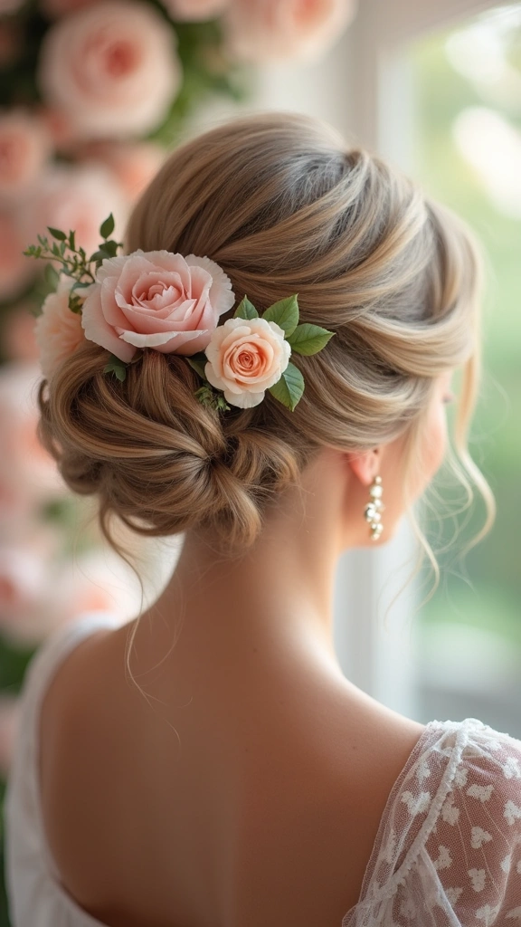You want a soft, flattering look. A romantic updo with flowers fits you. Great for weddings, garden parties, or any day you want a feminine touch.