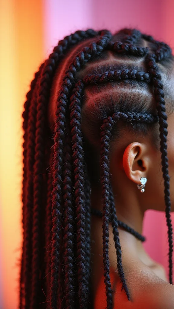 Why stick to the basics when you can embrace bold colors? This hairstyle is a perfect canvas for playful color experiments. Bright shades for box braids can create a striking contrast against the dark cornrows, making your style pop. Think deep burgundy paired with bright blonde or rich navy with light brown. The mix of colors adds depth and energy to your look, making it stand out.