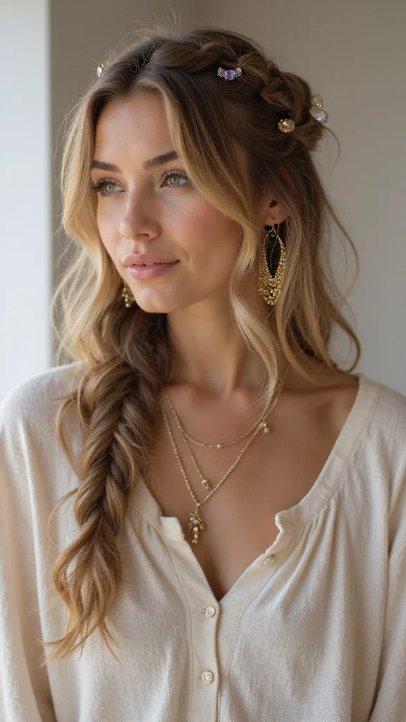 Bohemian braids paired with loose waves create a relaxed yet stylish vibe, perfect for casual outings or festivals. This look celebrates effortless beauty while embracing natural texture. You can enhance this style with an ombre effect or color highlights, making it even more eye-catching.