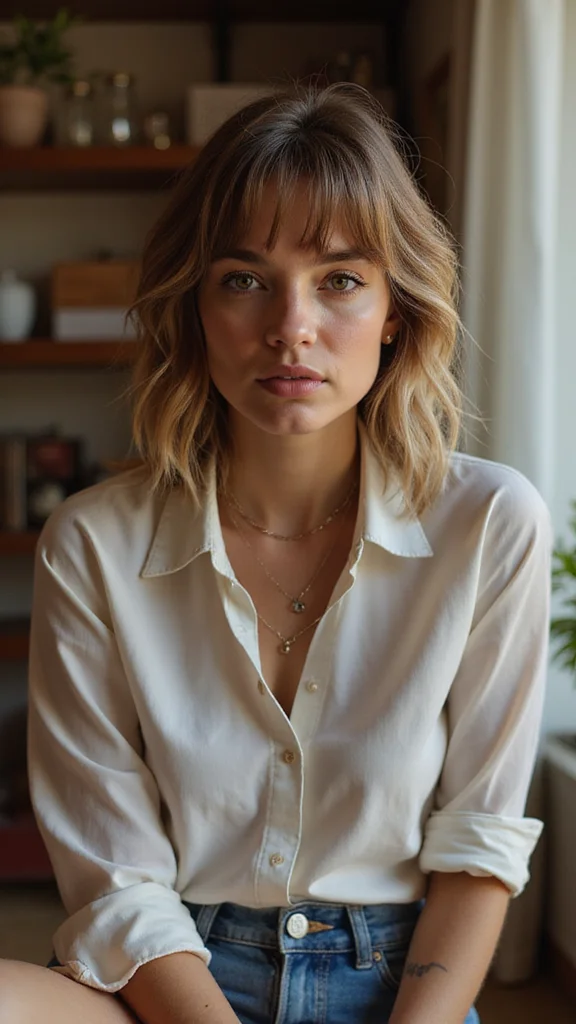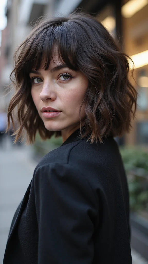 Soft, curtain-like bangs paired with a shaggy bob create a romantic vibe. This style beautifully complements loose waves that flow effortlessly. Picture yourself with gentle bends in your hair, adding a polished touch to your look while keeping it casual. This dreamy hairstyle is perfect for both outings and special occasions, as seen in fashion magazines.