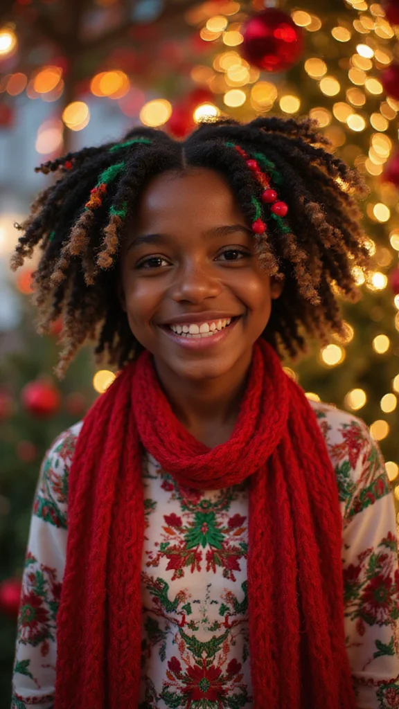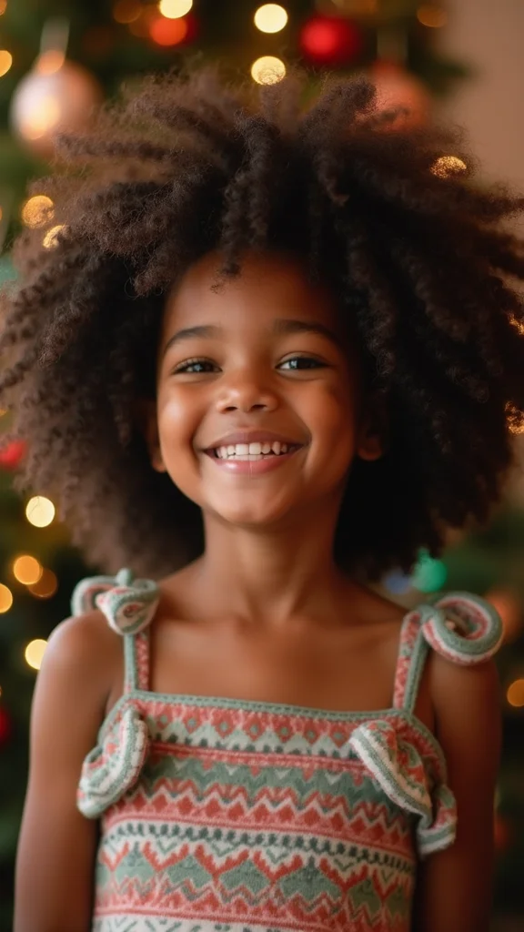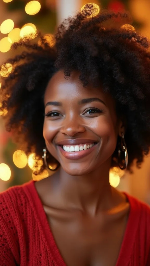 For easy styling, apply a light mousse to enhance your curls and keep them defined. You can find festive hair clips at local stores to make the look pop! This hairstyle allows your creativity to shine while being simple and chic for any holiday occasion.
