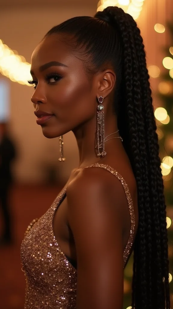 For a polished finish, use a styling cream to smooth any frizz. Choose a ponytail height that complements your face shape for the best results. A sparkly scrunchie will add a festive flair to complete your look!