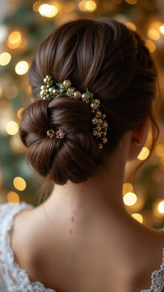 To create this updo, divide your hair into medium sections, twist each one, and secure them into a bun. Add in gold clips or hairpins to elevate the sparkle! This hairstyle is not only elegant but also quick to achieve, giving you more time to enjoy the festivities.