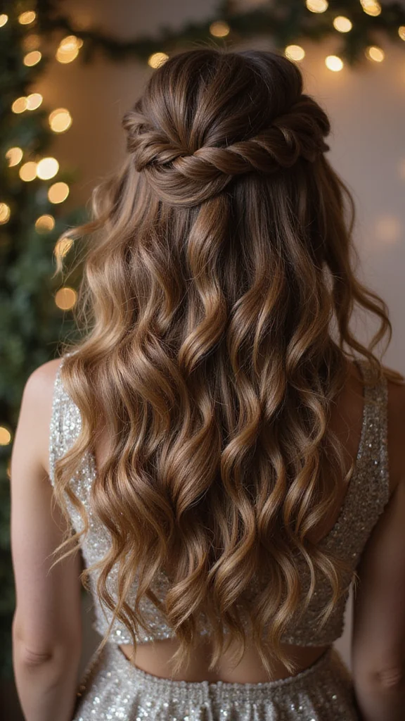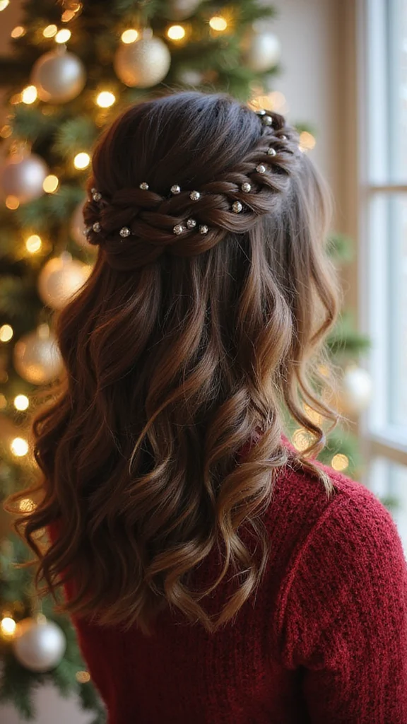 To achieve this look, curl the bottom half of your hair for gorgeous waves, leaving the top half pulled back with ties or clips. Add beads to the ends of your curls for a fun twist that glimmers in the holiday lights. This hairstyle works well with both long and curly textures, making it a stylish option for everyone.