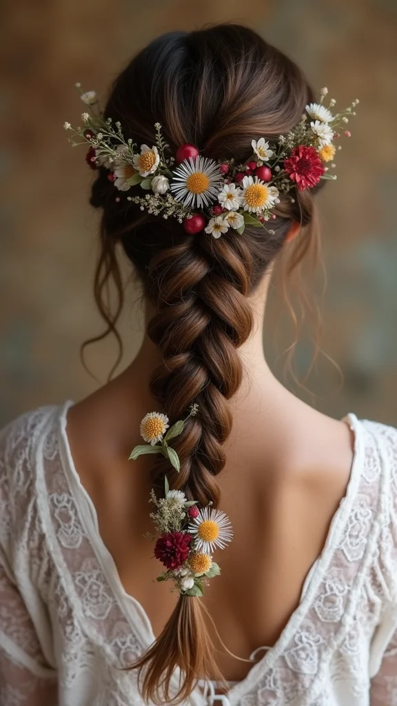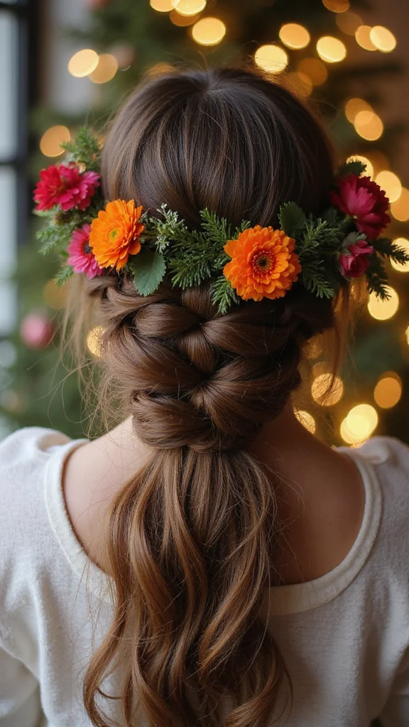 To create this look, braid your hair as you typically would, incorporating sprigs of dried flowers or greenery along the braid. You can use a simple three-strand braid or opt for a fishtail braid for a different texture. This style is great for outdoor gatherings or casual holiday parties.