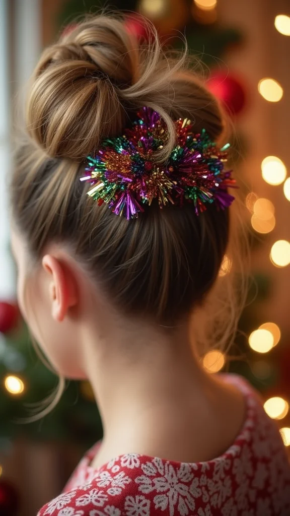 For a bold and eye-catching hairstyle, try out a knotted bun embellished with tinsel! This fun and whimsical look is perfect for those who want to stand out during the holiday celebrations. The tinsel adds a festive sparkle, making your hairstyle truly shine.