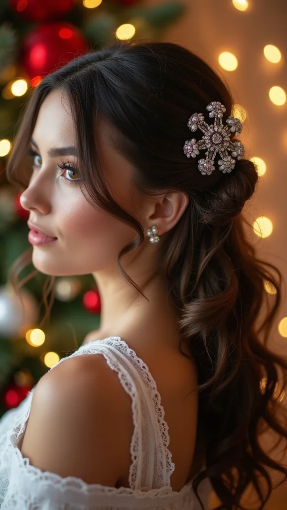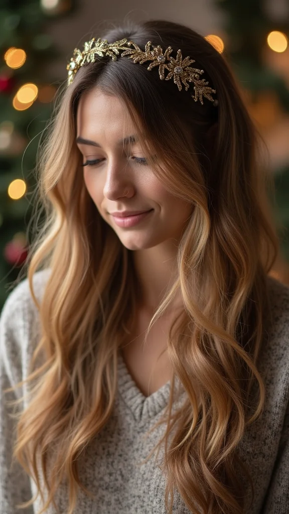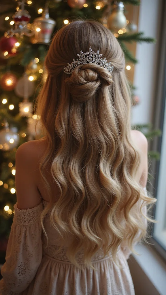 To achieve this look, create soft waves using a curling iron, then let them fall gracefully down your shoulders. Placing a sparkling tiara at the crown of your head adds elegance and charm, enhancing your overall style. This hairstyle is ideal for those wanting to feel magical and glamorous during the holidays.