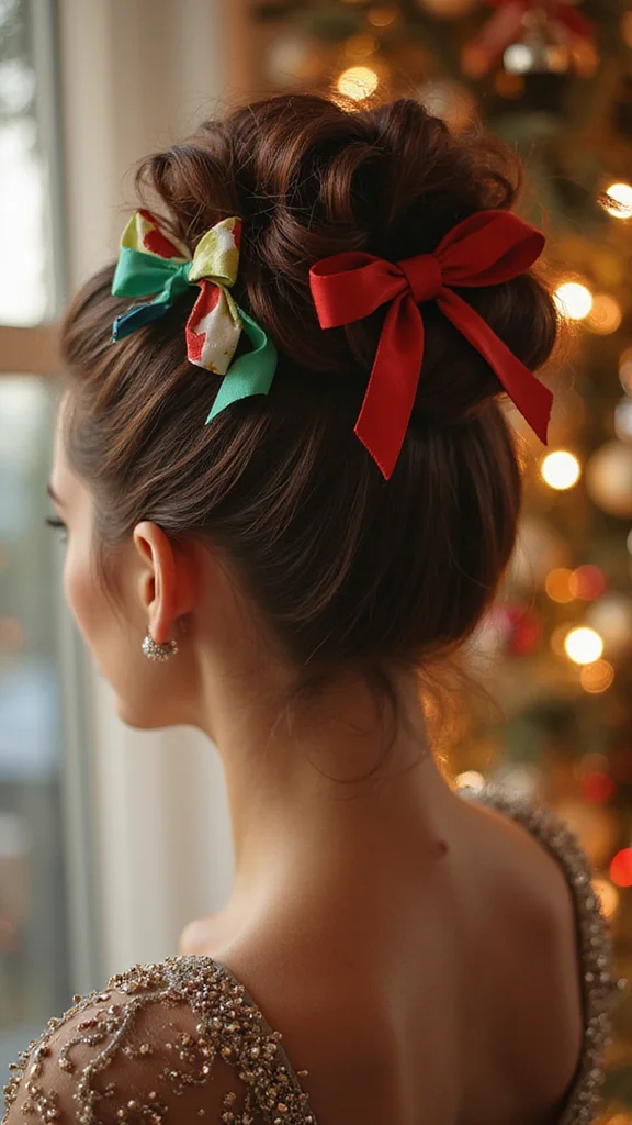 Add a retro vibe to your holiday look with a bouffant hairstyle topped with ribbons! This style brings back memories of glam and is sure to turn heads at any party. The volume and playful ribbons create a statement piece for your festive wardrobe.