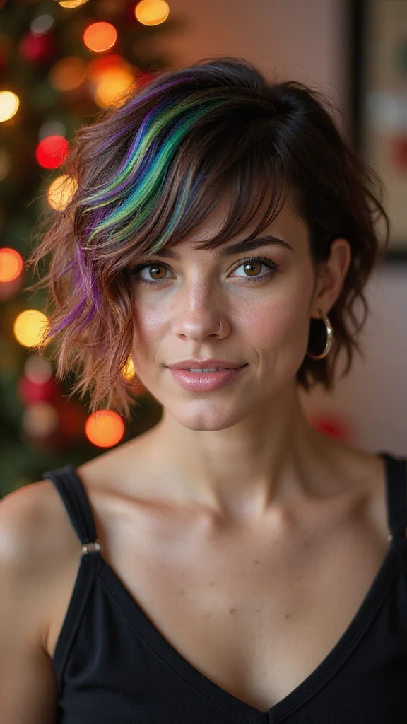 To achieve this style, get a choppy haircut with layers, then add vibrant streaks of color. These streaks can contrast with or match your outfit, creating a striking visual effect. This hairstyle is great for anyone wanting to express their individuality during the holidays.