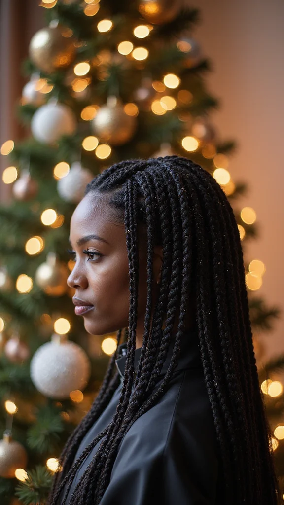 To create this look, ensure your box braids are neat, then apply hair glitter to the ends and throughout the braids. The shimmering accents catch the light beautifully, adding festive cheer. This hairstyle is also perfect for those busy days when you need a quick yet stylish option.