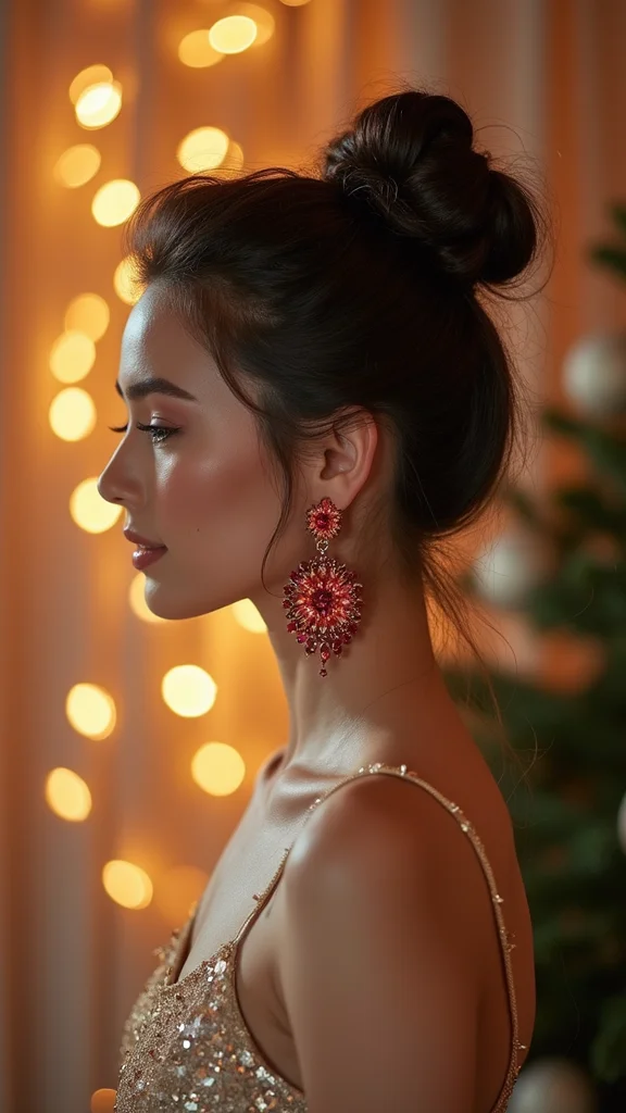 To create this chic look, straighten your hair and pull it back into a high bun, securing it tightly. Choose eye-catching earrings that pop against your sleek hair for added glamour. If your hair is shorter, consider using hairpieces to create a fuller bun, enhancing the luxurious feel of the style.