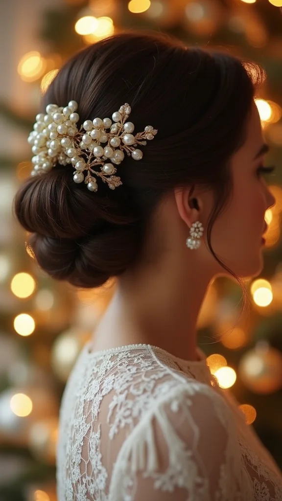 For a sophisticated holiday look, try an elegant chignon hairstyle adorned with pearls. This classic bun not only looks stunning but also keeps your hair neatly styled throughout the evening. The addition of pearl accents brings a touch of luxury to your overall style.