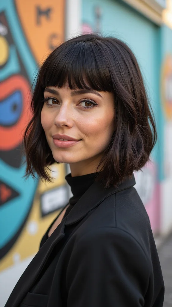 Curtain bangs are making a comeback and pair wonderfully with bob haircuts, especially for round faces. These bangs frame the face softly, adding a romantic touch that helps to refine your features. This trendy style is all about versatility, allowing you to switch between sleek and wavy looks.