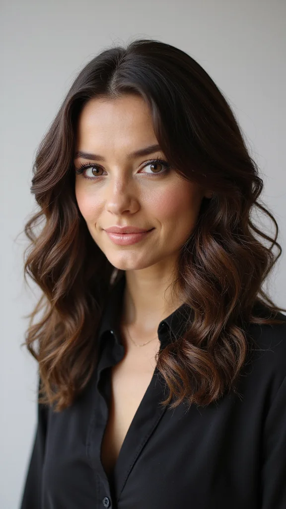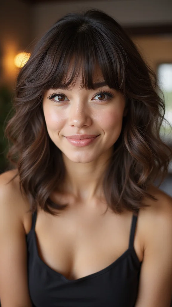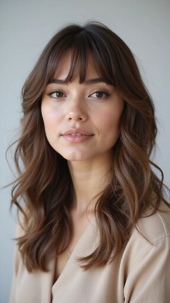 To recreate this style, ensure your bangs hit just below your brows for the best effect. Use a curling wand to create soft waves that start mid-length, adding a touch of body and movement. This look is versatile and can easily transition from day to night, making you feel stylish and put-together.