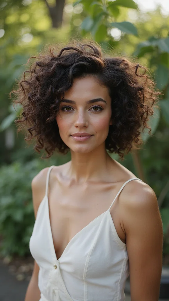Messy hairstyles are very much in style, and a curly A-line bob captures this effortlessly chic vibe. This look embraces relaxed curls that appear tousled yet polished, creating a carefree and stylish appearance. Think about using a spray with sea salt to give your hair that beachy, relaxed feel. This style has been popularized by many influencers for its laid-back charm.