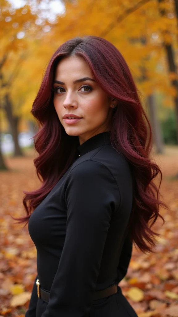 Dark cherry red brings drama and glamour to your fall look. This bold color is perfect for adventurous spirits, providing a rich hue that’s both striking and versatile. Picture yourself turning heads with this vibrant shade that pairs beautifully with earthy tones for a stunning autumn aesthetic.