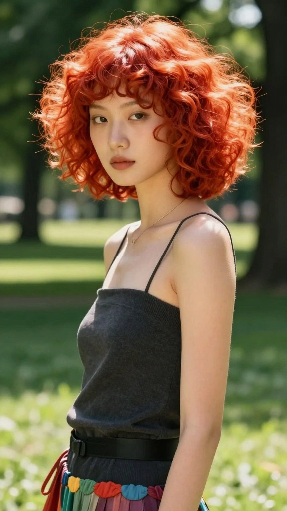Bright orange is a vibrant and energetic color that infuses fun into short curly hairstyles. This bold hue instantly brightens your look, allowing you to fully express your personality. Bright orange curls are perfect for summer, making them ideal for beach outings and festivals.