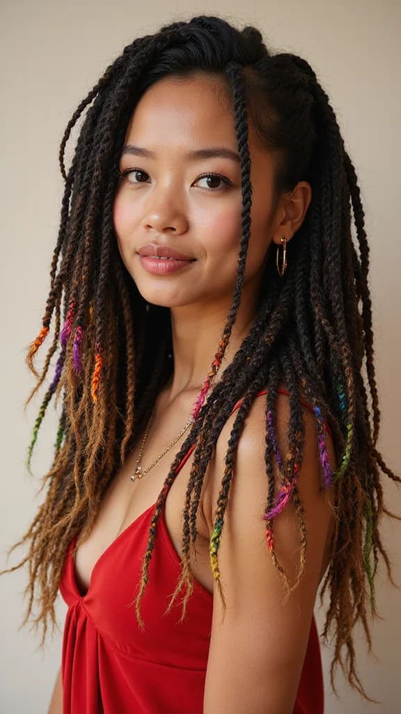 Twisted dreads with colorful tips add a striking contrast to your hairstyle. Twisting sections of your locs and adding bright ends create a bold statement. It’s perfect for those wanting to showcase their fun side!