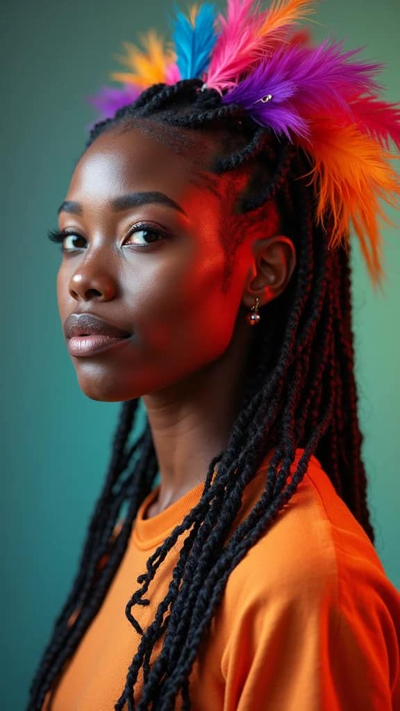 To achieve this look, gently secure feathers within your locs for comfort. Vary lengths and colors to create a layered effect. Maintaining hydration is key for a smooth finish. This whimsical style enhances your locs while bringing a playful vibe!