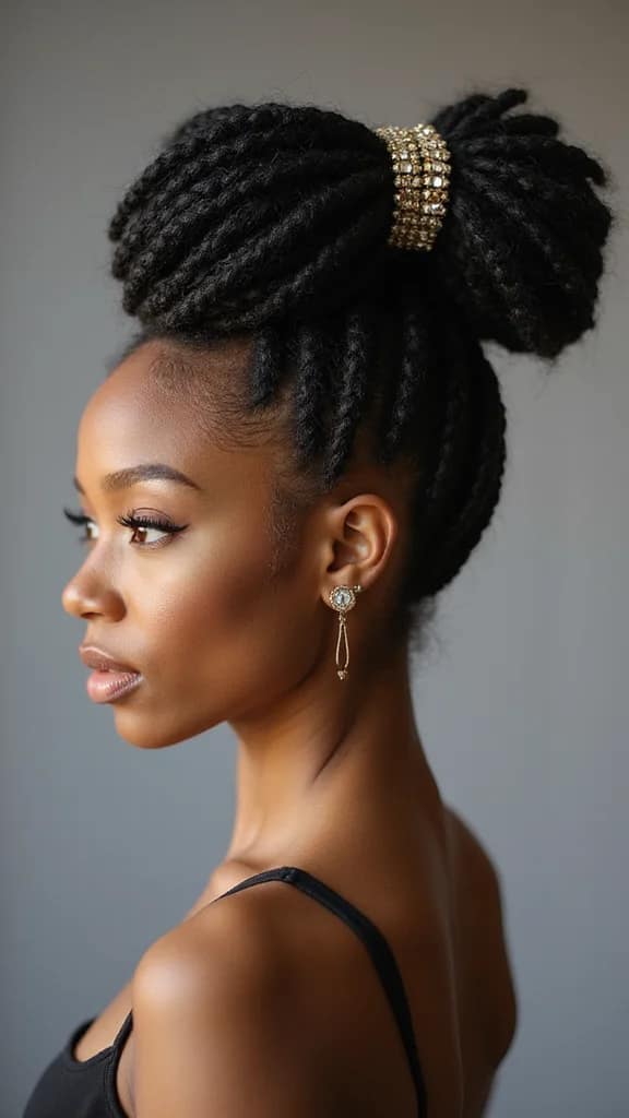To get this style, secure the twists with bobby pins. Decorate with flowers or hair jewelry to enhance the elegance. Make sure your locs are well-moisturized for the best shine. This hairstyle radiates grace and beauty, making any occasion memorable.