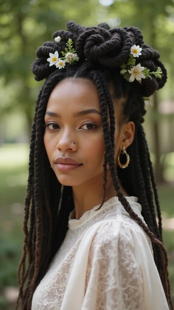 To get the look, use hairspray to hold your curls in place. Adding ribbons or flowers can enhance the playful vibe. Keep your locs hydrated for that beautiful shine. This unique style showcases your locs while offering a fun twist!
