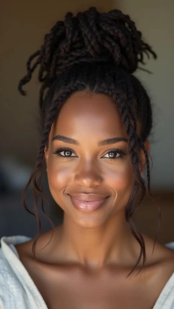 To nail this style, use a scrunchie that matches your outfit for a fun touch. Leave some locs free on the sides for a relaxed feel. Regularly moisturize your locs to keep them looking healthy. This style is all about comfort and charm while remaining chic!