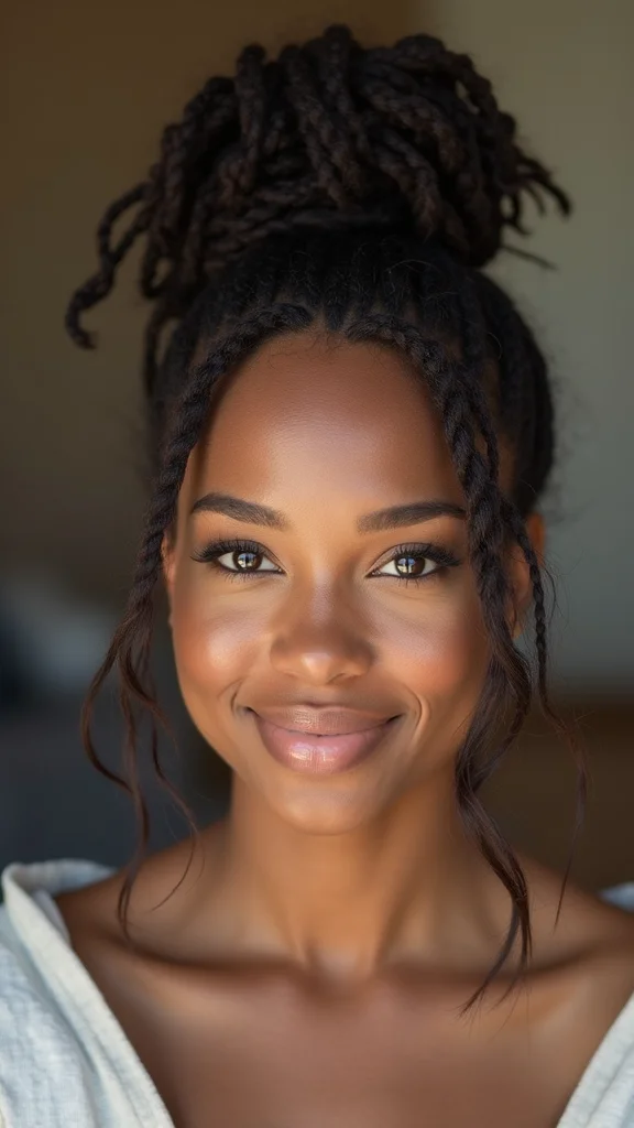 For a carefree vibe, the messy dread bun is your go-to style! Gather your locs into a bun at the top of your head, letting some strands fall loose for that effortless look. It’s perfect for casual outings or relaxing at home!
