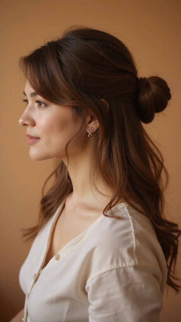End our list with the relaxed half-bun, a super easy and laid-back hairstyle! This style combines comfort with flair, making it perfect for cozy nights in or running errands. Picture a messy bun that captures the essence of effortless style.