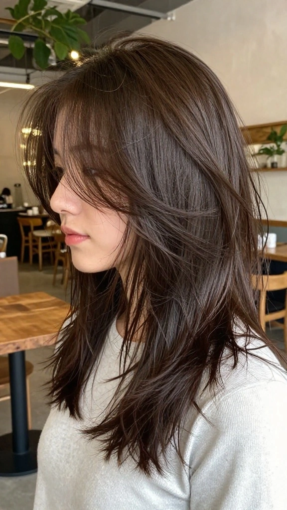 Wrapping up our list is the textured shag with side-swept bangs! This hairstyle beautifully merges playful texture with the sophistication of side-swept bangs. It’s an excellent choice for softening your features while adding depth to your hair.
