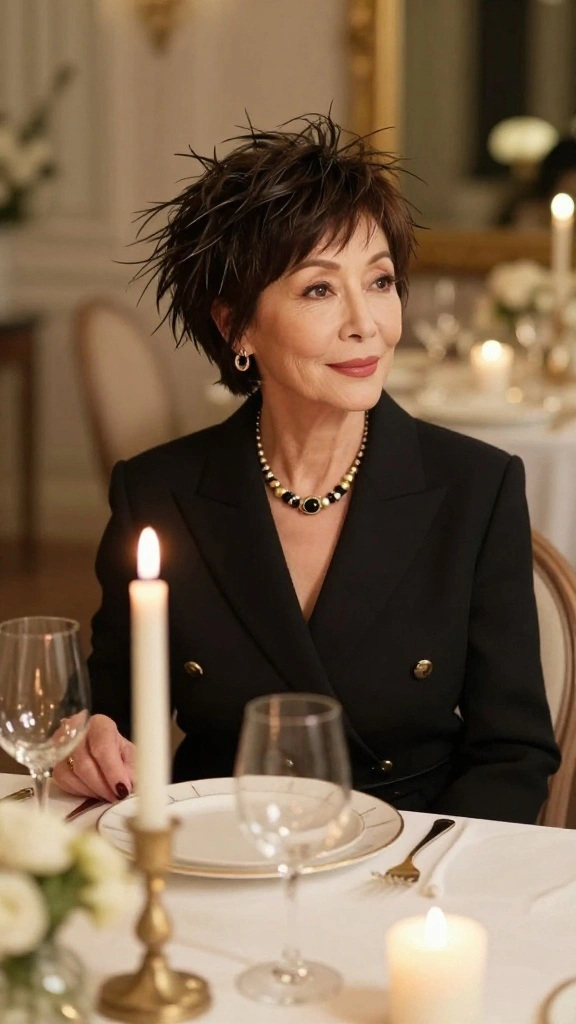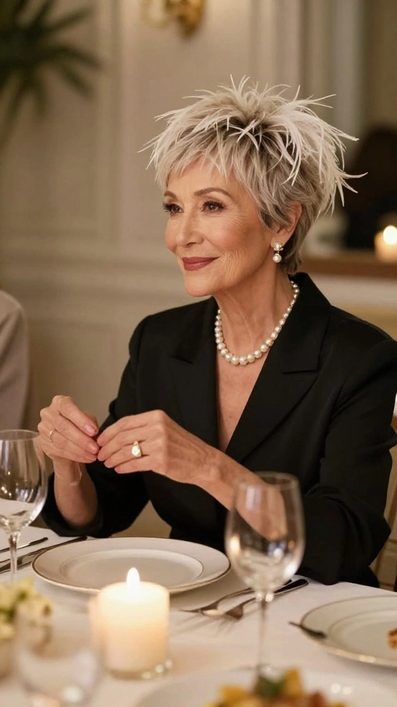The elegant feathered pixie is a sophisticated choice that marries modern style with classic elements. This cut features feathering that adds softness and dimension, perfect for a refined yet youthful look. It’s an excellent option for women over 60 who wish to keep their hairstyles chic and trendy.