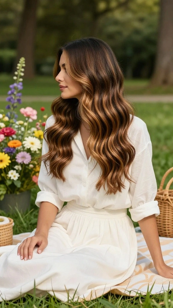 Enhance your summer look by coordinating your caramel highlights with your outfit colors! This fun approach creates a fashion statement that showcases your gorgeous hair beautifully.